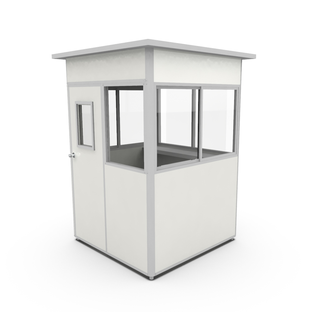 Además de sus propiedades de aislamiento superiores, nuestras casetas de vigilancia cuentan con ventanas en todas sus caras garantizando una vista panorámica de 360°. Esta caseta incluye un mesón tipo mostrador integrado y un amplio espacio para el personal de seguridad encargado.