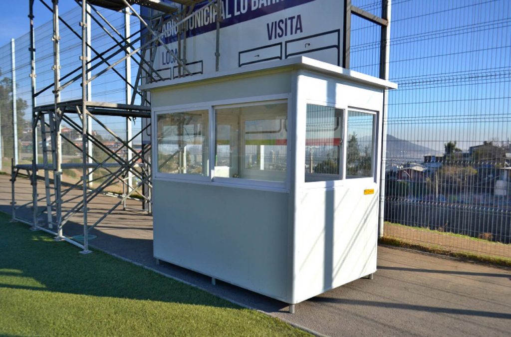 • Caseta para guardia y vigilancia con capacidad para 2-3 personas. Dimensiones 220x120, visión 360 ventanas de aluminio. Instalada